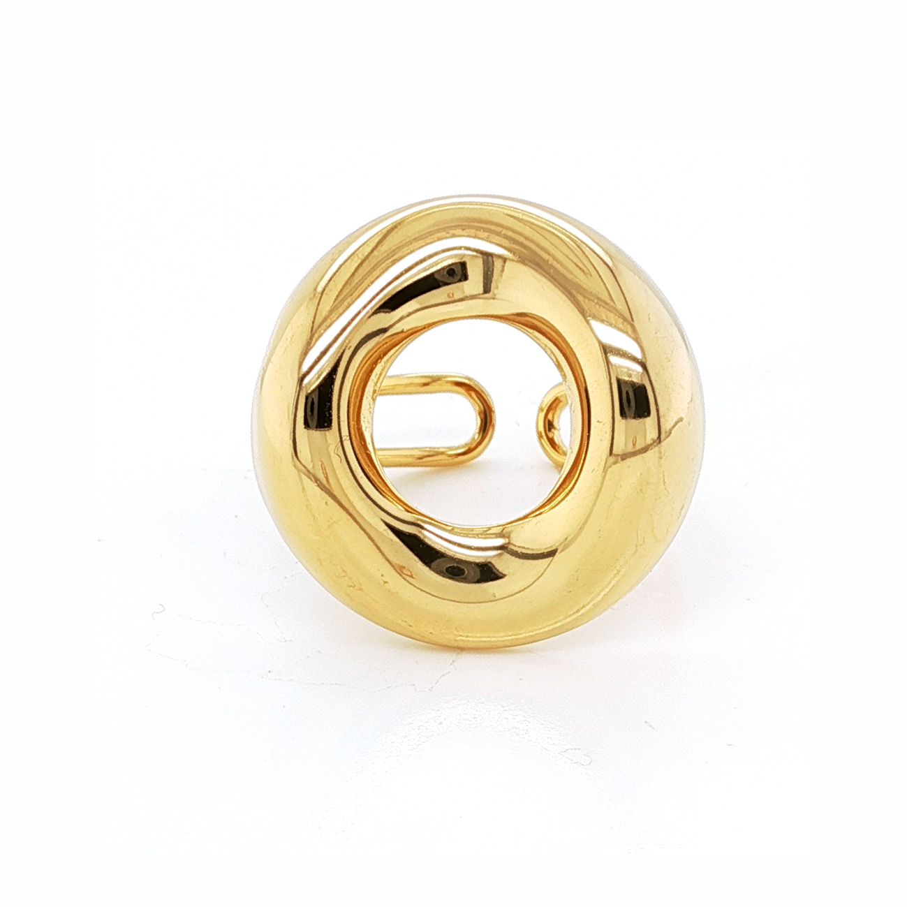 Cada peça é submersa num banho eletrolítico de ouro, onde a cor é absorvida até atingir a saturação máxima, tornando-se parte da própria superfície. Para finalizar, as peças são cuidadosamente polidas, garantindo um brilho imaculado.