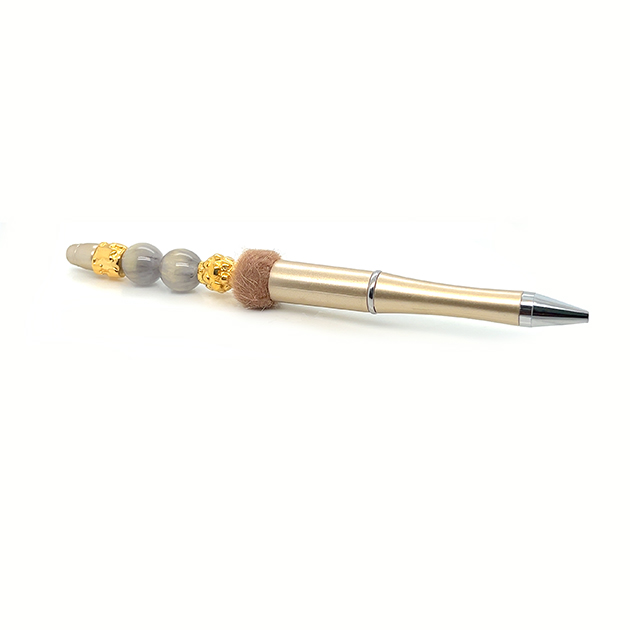 TRENDY PEN 2024. Caneta com base em plástico dourado com berloques metal e acrílicos efeito ‘mármore’ creme. Escrita em cor preta.