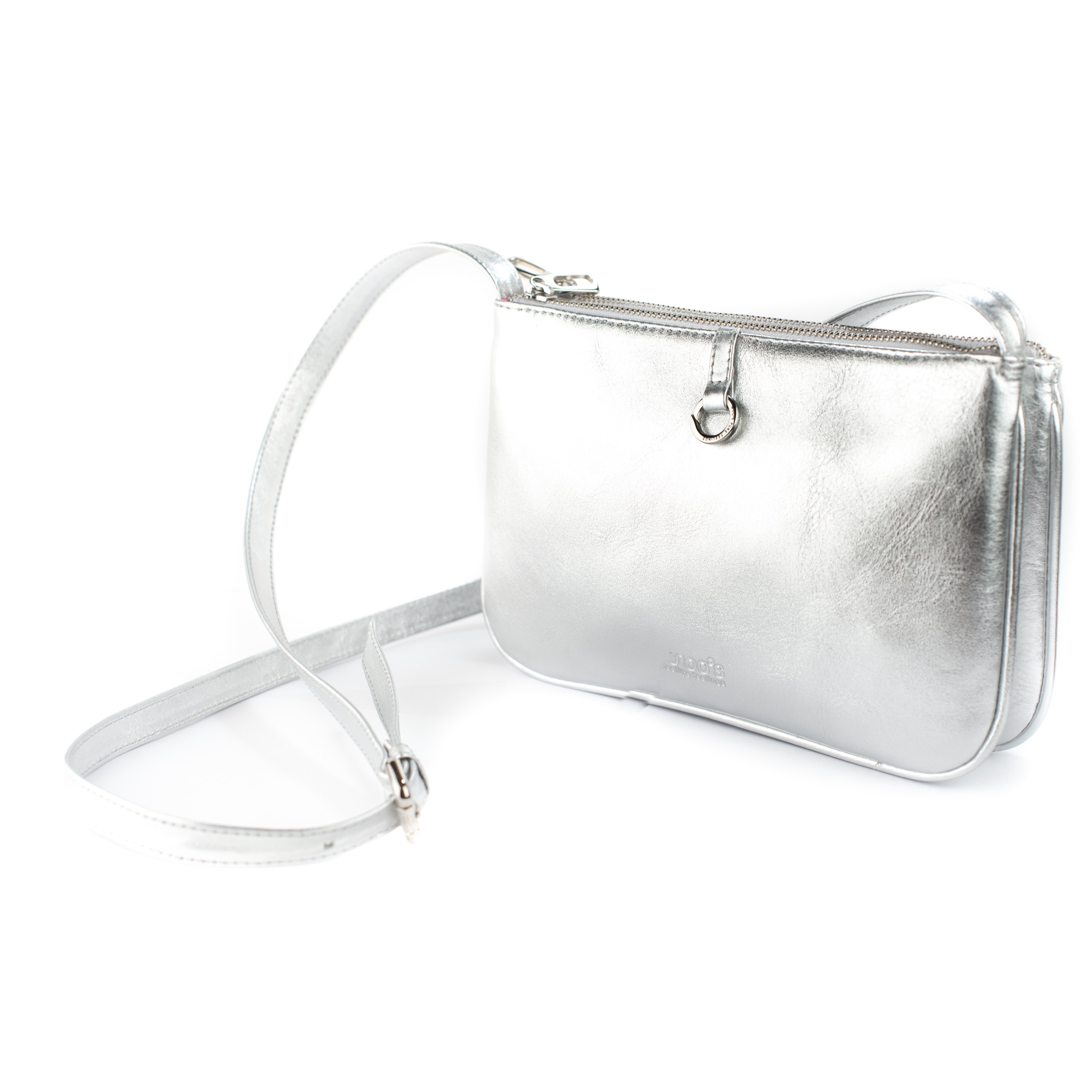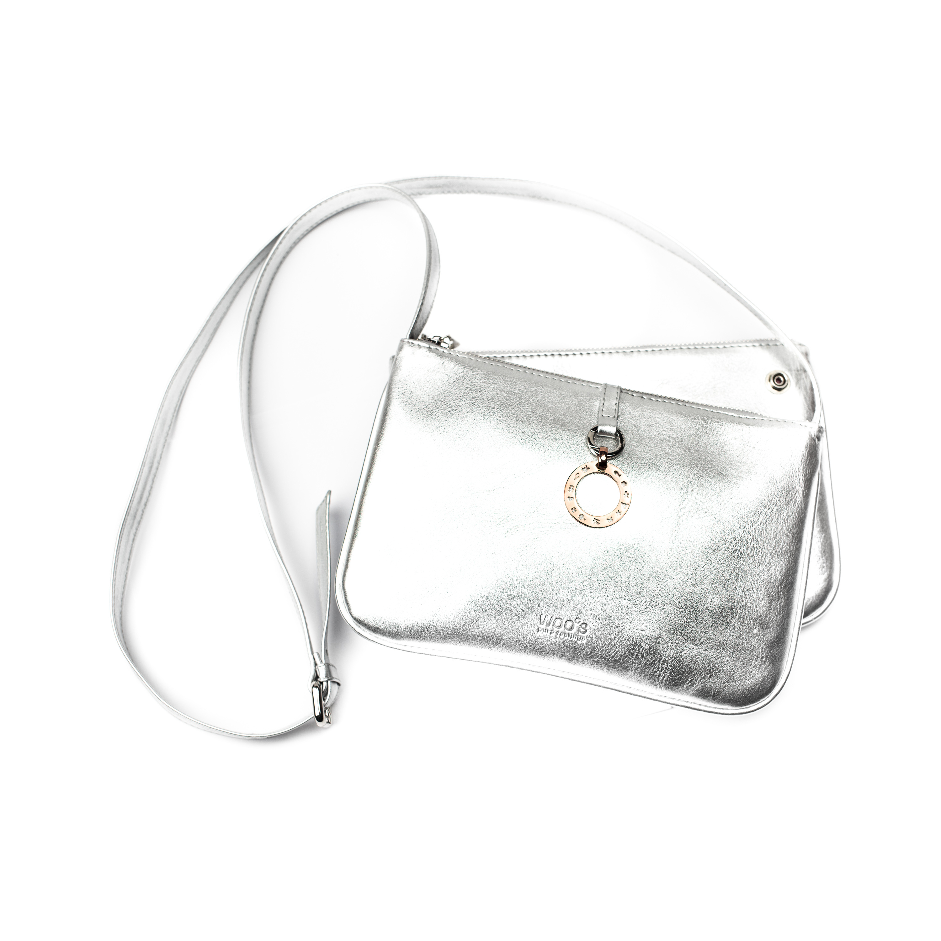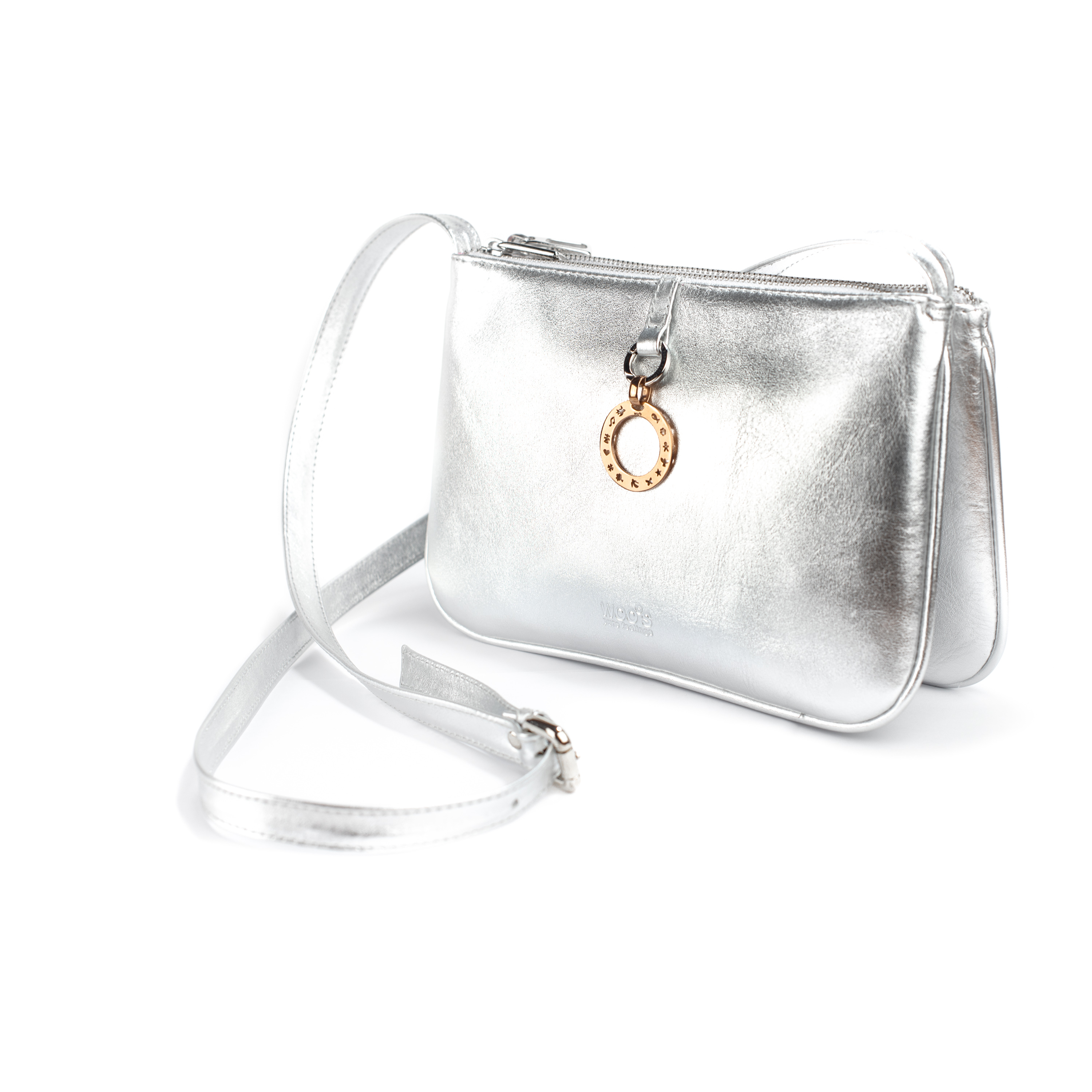 Mala de pele prateada com duas bolsas amovíveis e alça. Inclui conector de aço para poder pendurar a sua medalha favorita!