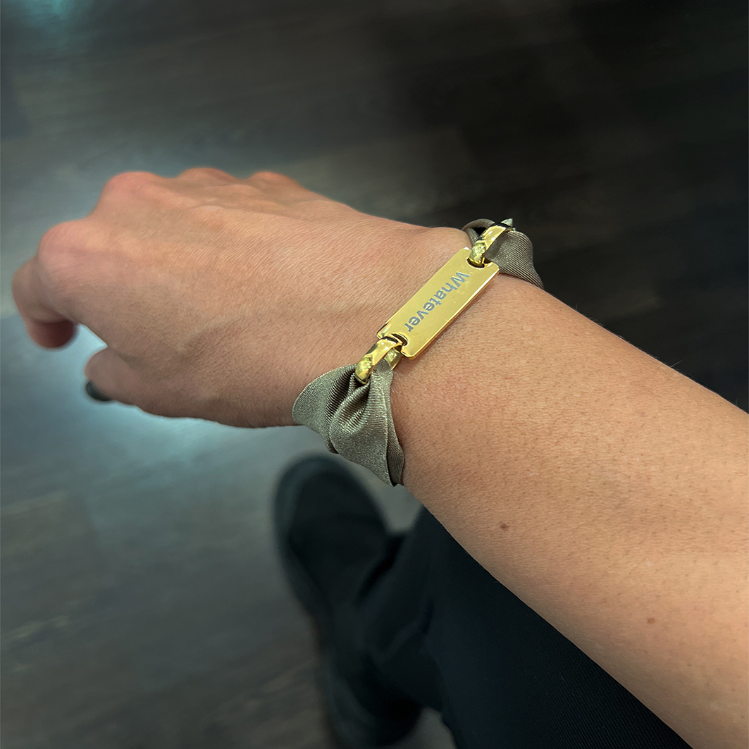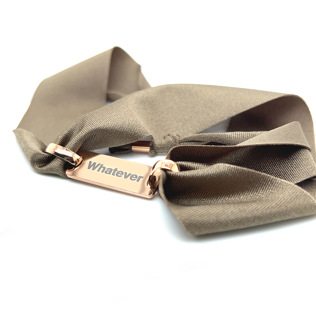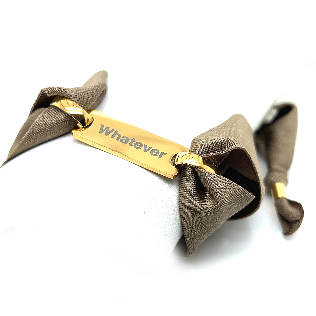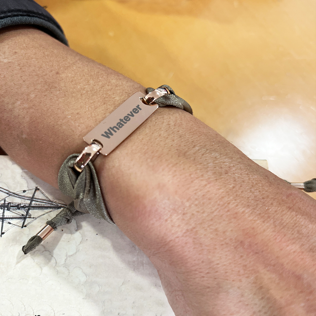 Pulseira de lycra com uma chapa e 2 argolas em aço, WHATEVER. Pode personalizar com a sua mensagem (max 15 letras) Outra lado da chapa é a nossa mensagem Woo’s: HAPPINESS (chapa branca e dourada) ou LOVE (chapa rosé).
