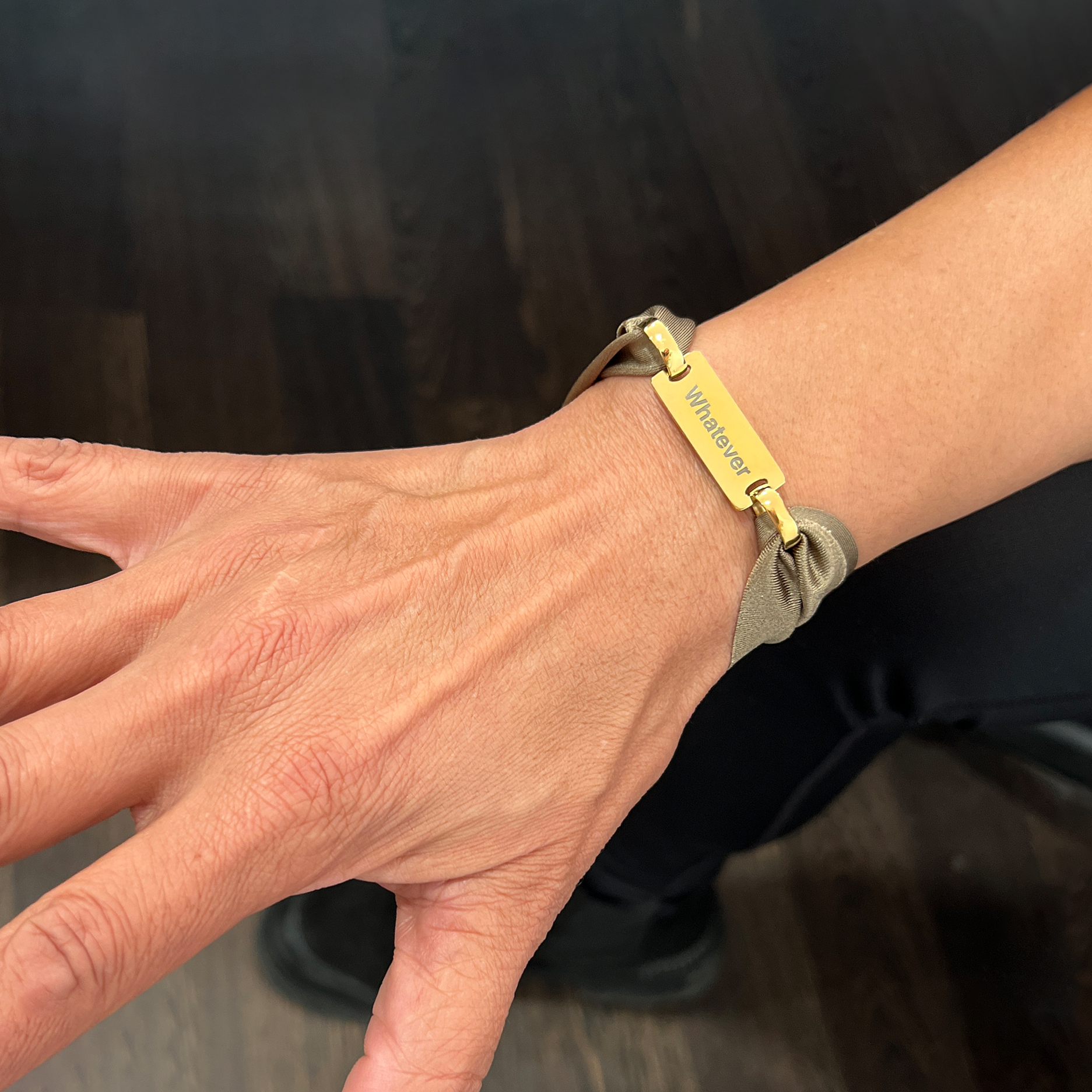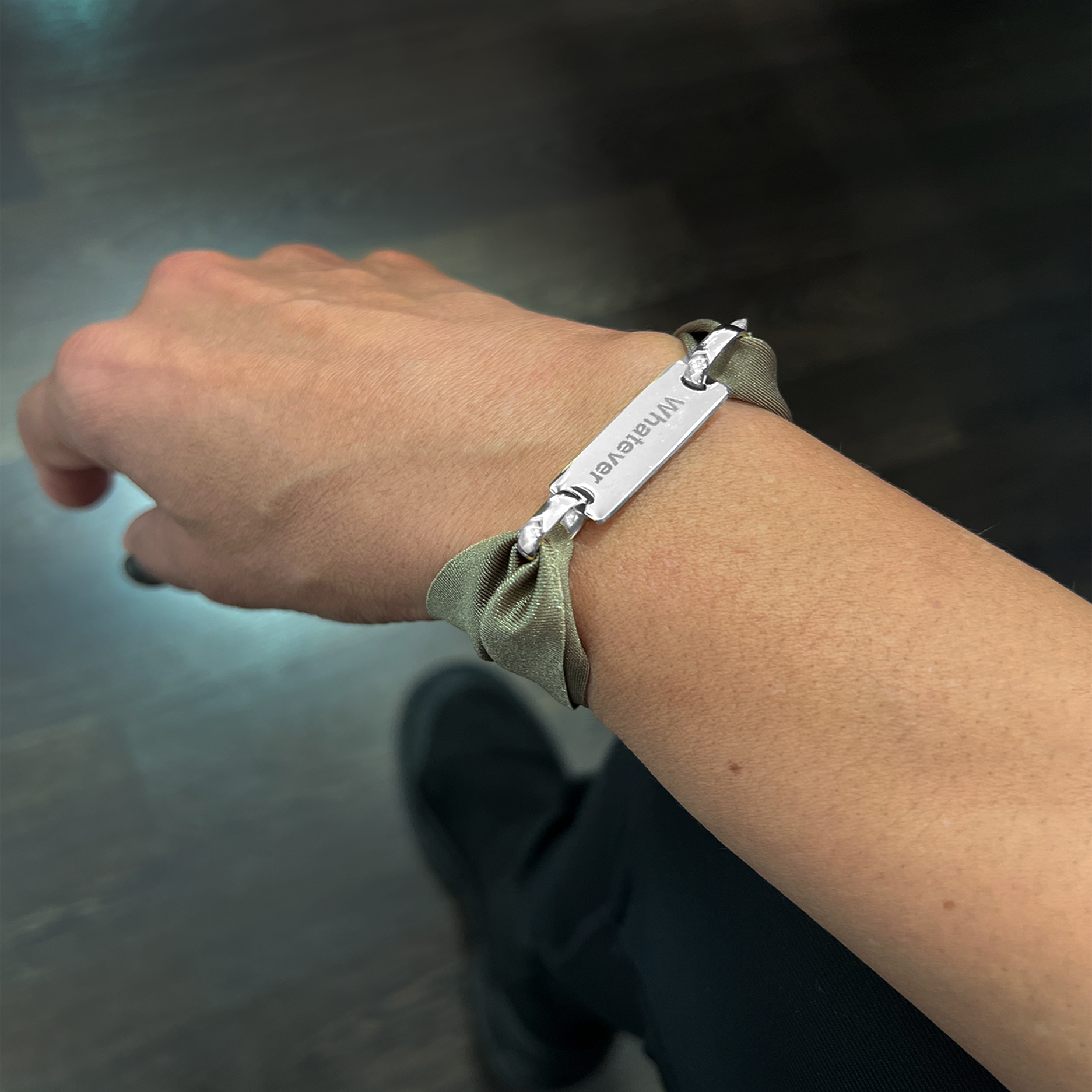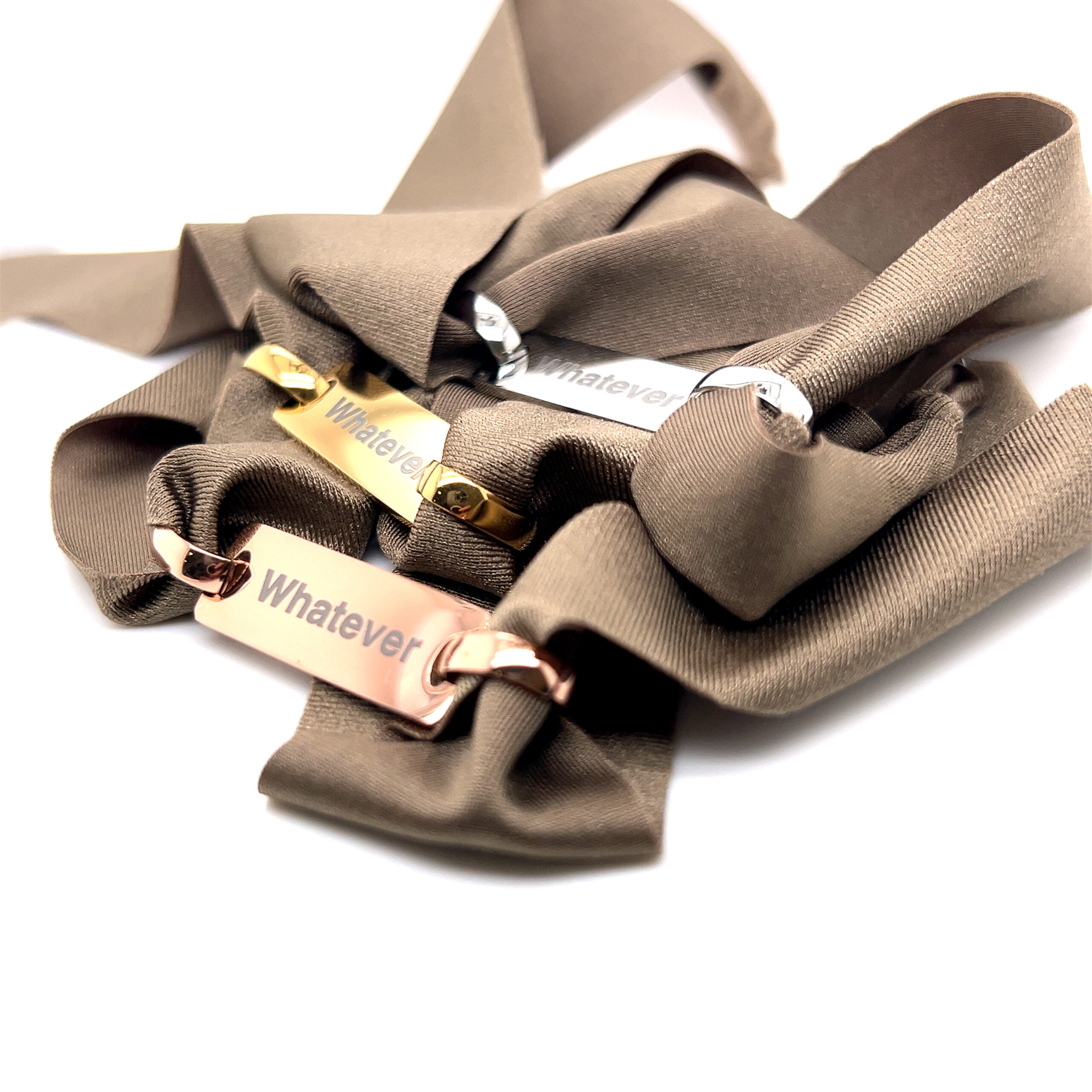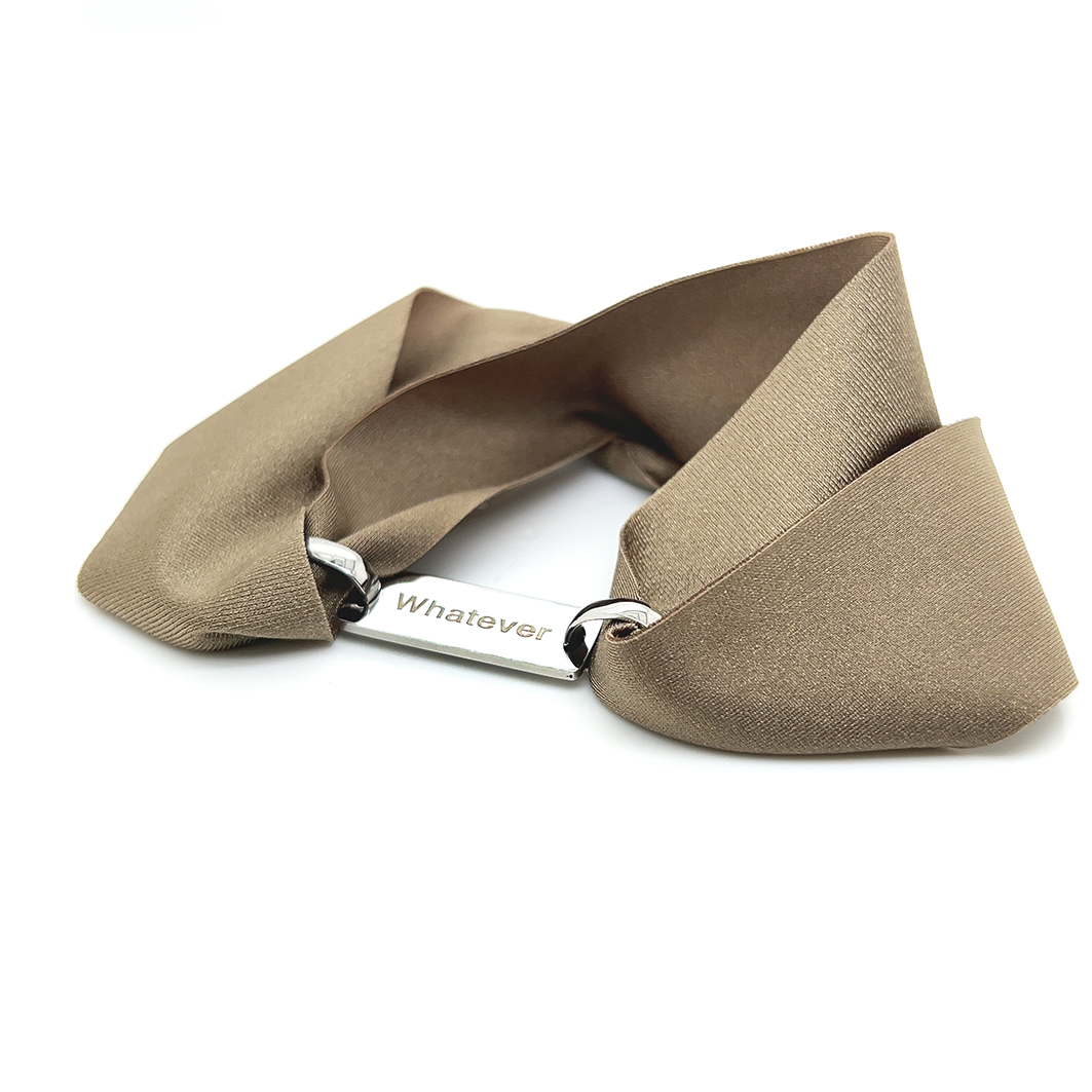 Pulseira de lycra com uma chapa e 2 argolas em aço, WHATEVER. Pode personalizar com a sua mensagem (max 15 letras) Outra lado da chapa é a nossa mensagem Woo’s: HAPPINESS (chapa branca e dourada) ou LOVE (chapa rosé).